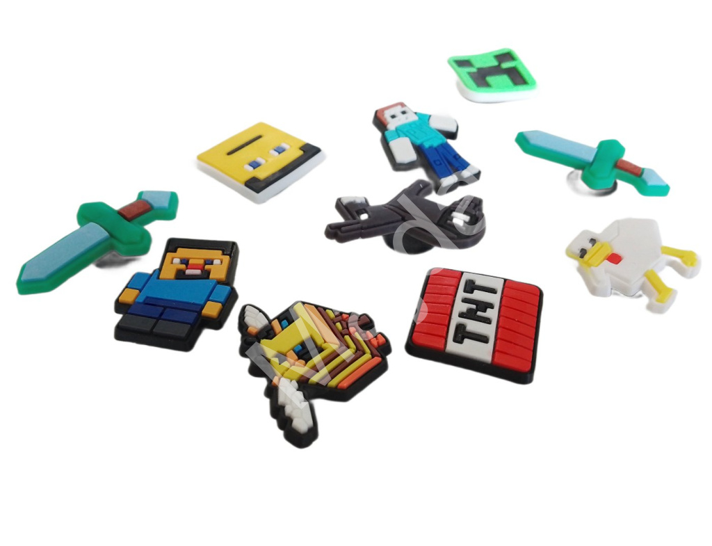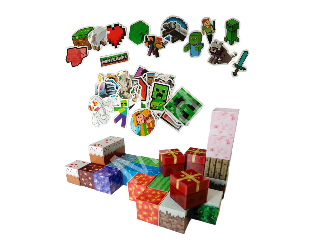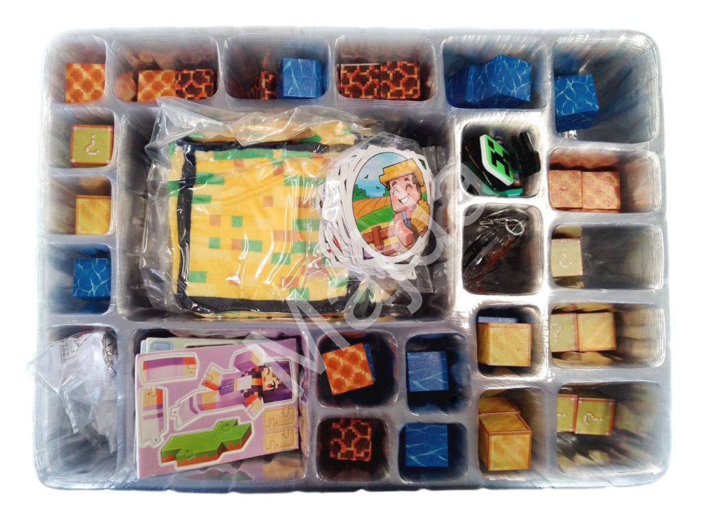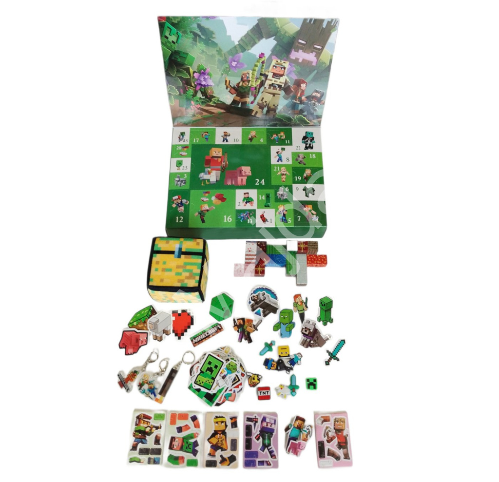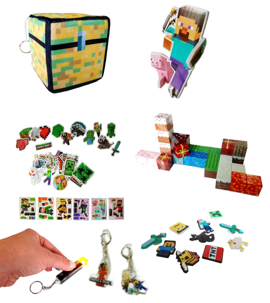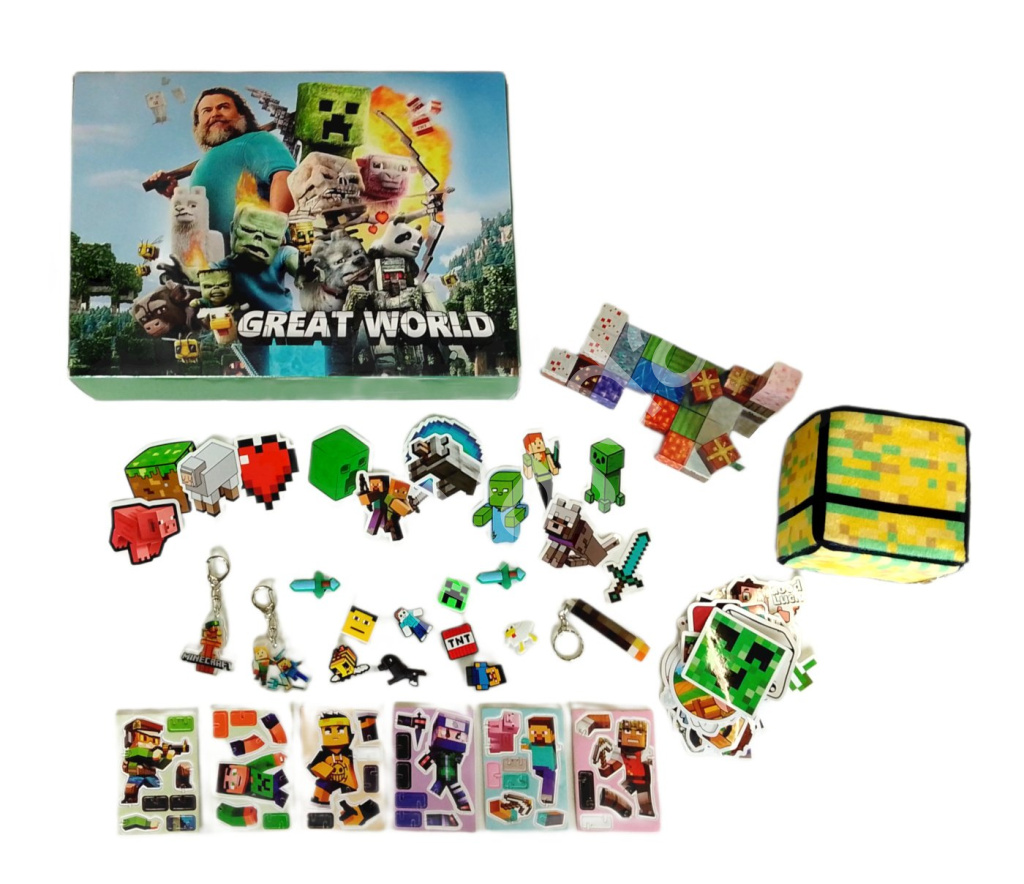 Uvnitř kalendáře najdete pestrý mix drobností – od magnetických stavebních kostek s herními texturami přes figurky, samolepky a gumové přívěsky až po tematické klíčenky a dekorace. Výraznou součástí je i měkká kostka s designem truhly, která slouží jako hrací prvek. Vše laděno v ikonickém Minecraft stylu.