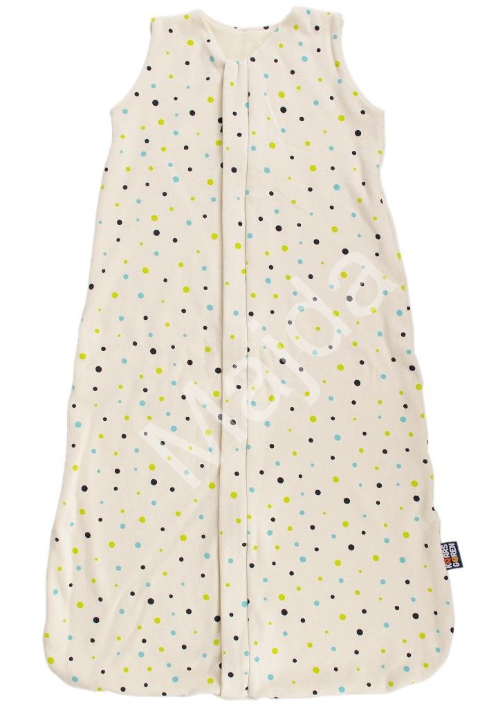 Spací pytel s podšívkou z úpletu z merino vlny. Vnější strana je ze 100% bio-bavlny s motivem barevných puntíků. Délka spacího pytle je 100 cm - to je délka miminka od ramen k chodidlům. Lze prát v pračce na max 30°C program… Více informací