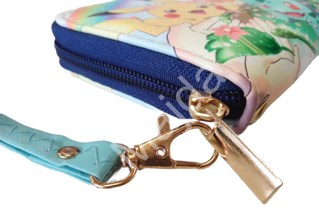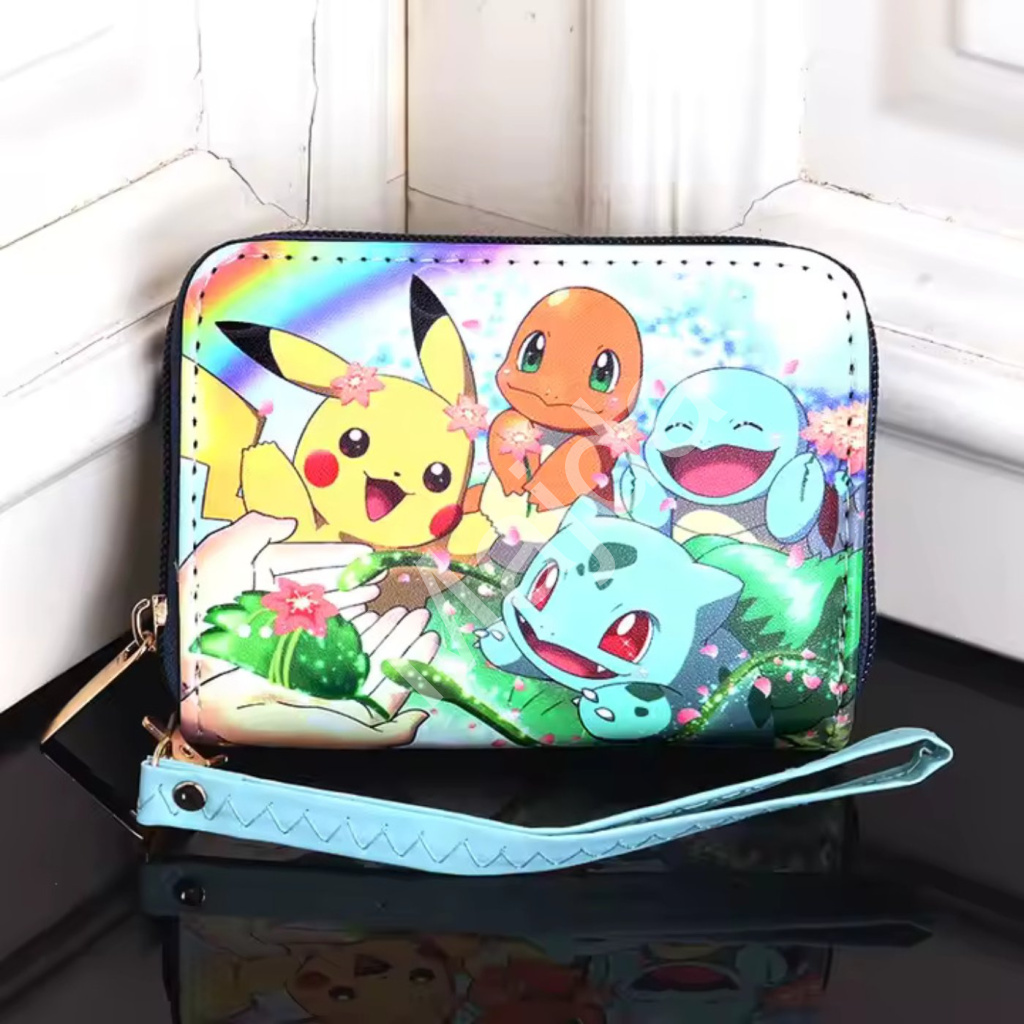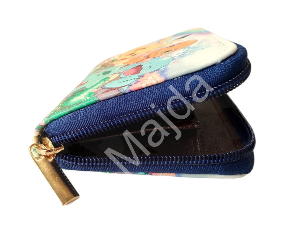 Na přední straně jsou vyobrazeni oblíbení Pokémoni – Pikachu, Charmander, Bulbasaur a Squirtle – v roztomilém a veselém provedení plném barev, květin a duhy. Design peněženky je hravý a zábavný, ideální pro děti, které si chtějí nosit kapesné stylově.