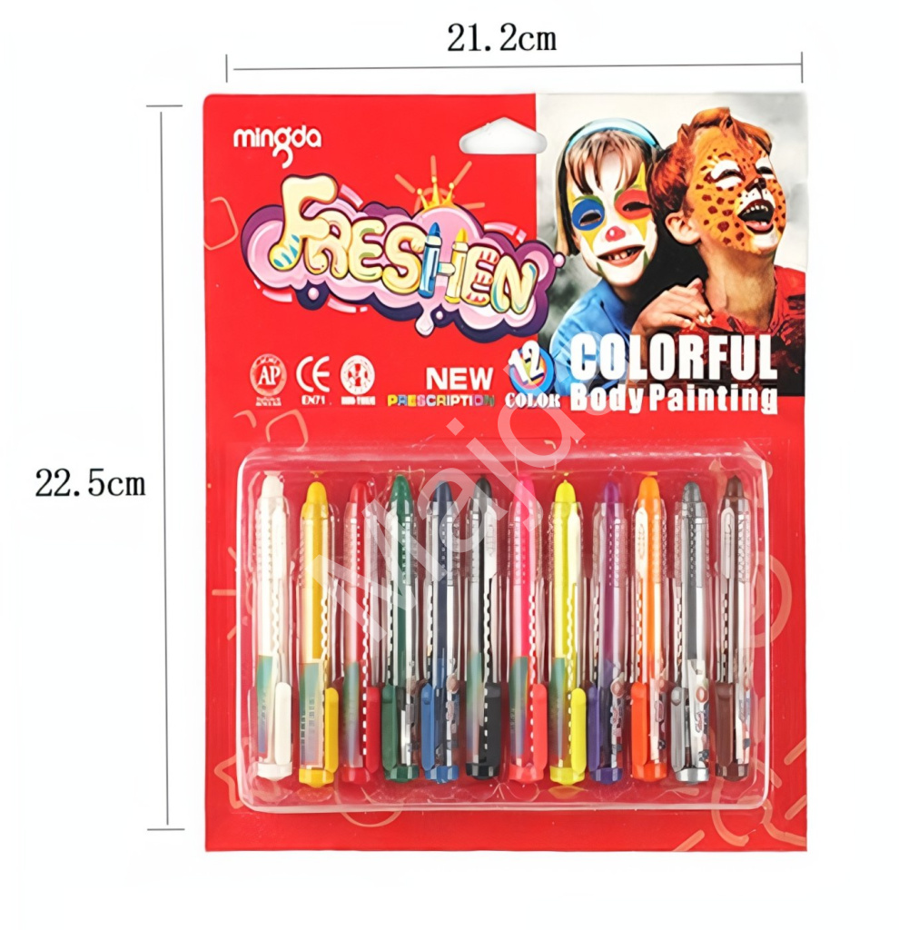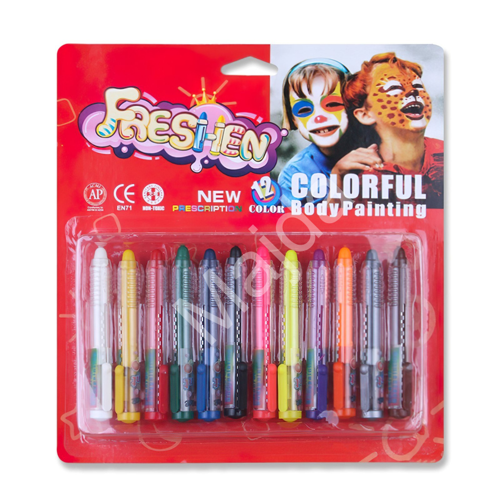 Dětská sada barev na obličej v tužce obsahuje 12 základních barev, které jsou ideální pro hravé líčení, karnevaly, oslavy nebo školní akce.