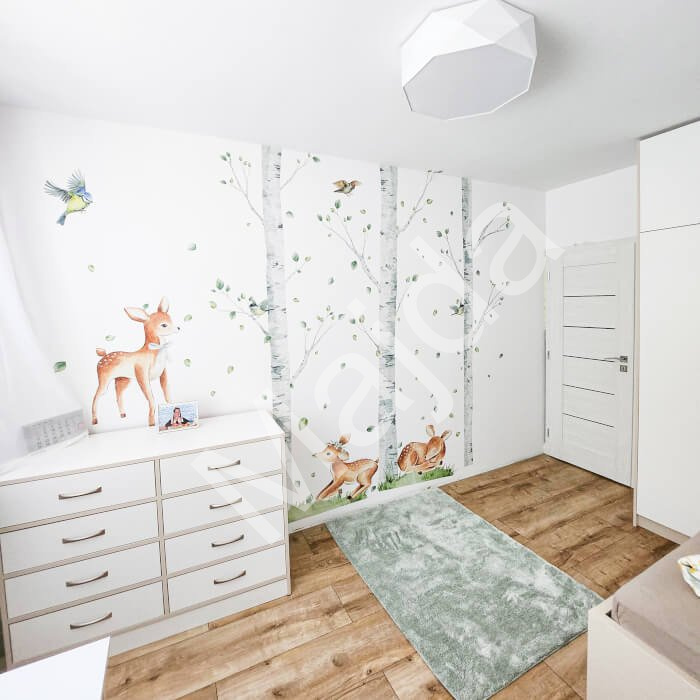 Samolepka na stěnu - zvířátka a stromy vypadají po nalepení na zeď jako živé. Tlumené a klidné barvy potěší oči každého znalce krásy.