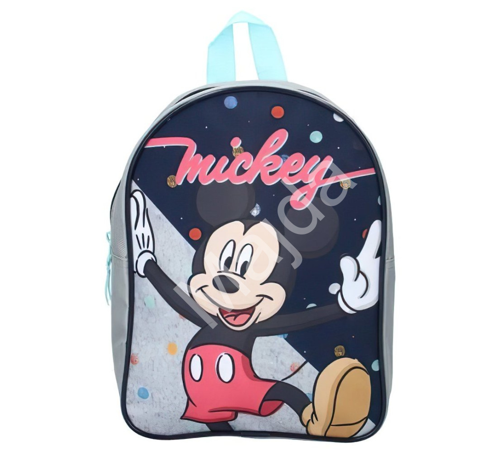 Na přední straně batohu září veselý Mickey v červených kraťasech, doplněný nápisem „Mickey“ a barevnými puntíky na tmavě modrém pozadí. Tento hravý a zábavný design zaručeně potěší děti a dodá jim radost při každodenním používání – ať už ve školce, na výletě nebo při jiných aktivitách.