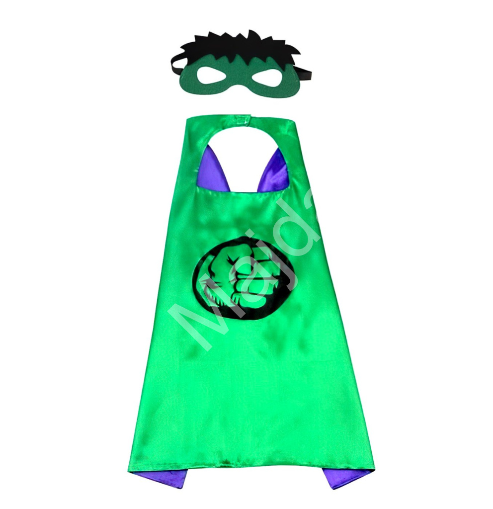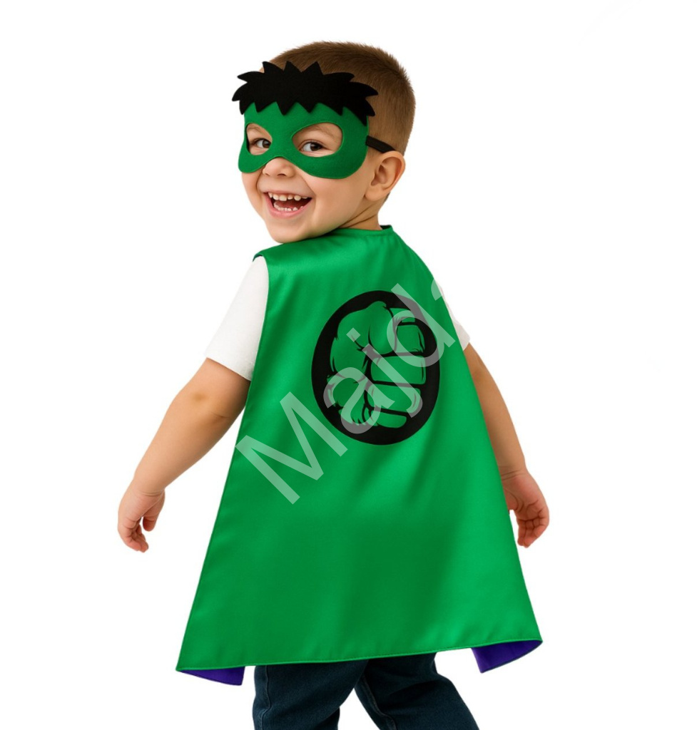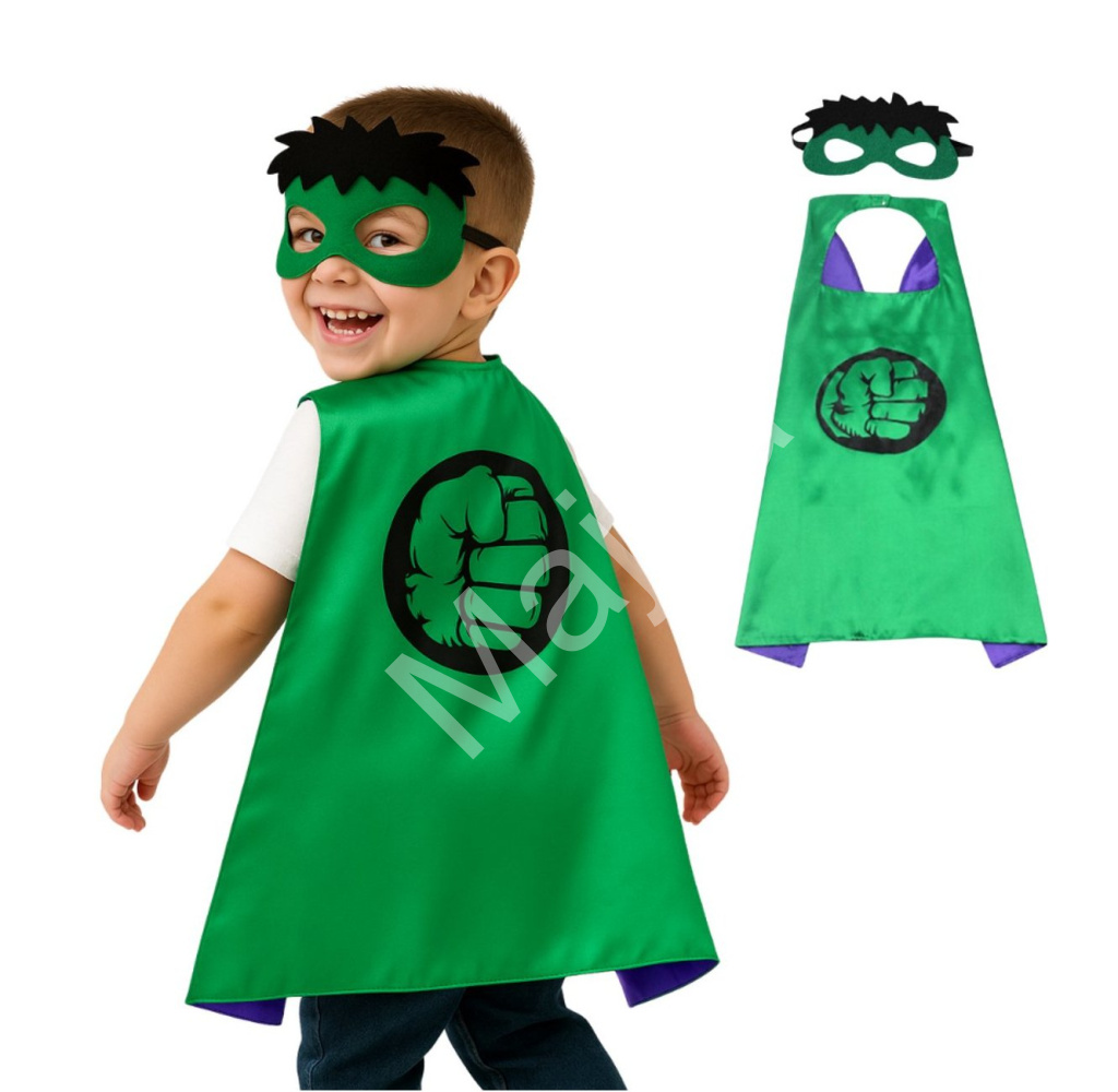 Tento stylový set se skládá z lesklého zeleného pláště s ikonickým motivem pěstě Hulka a doplňkové masky s černými vlasy a zeleným okrajem kolem očí. Děti se během okamžiku promění v neohroženého Avengera a stanou se hvězdou každého karnevalu nebo narozeninové oslavy.