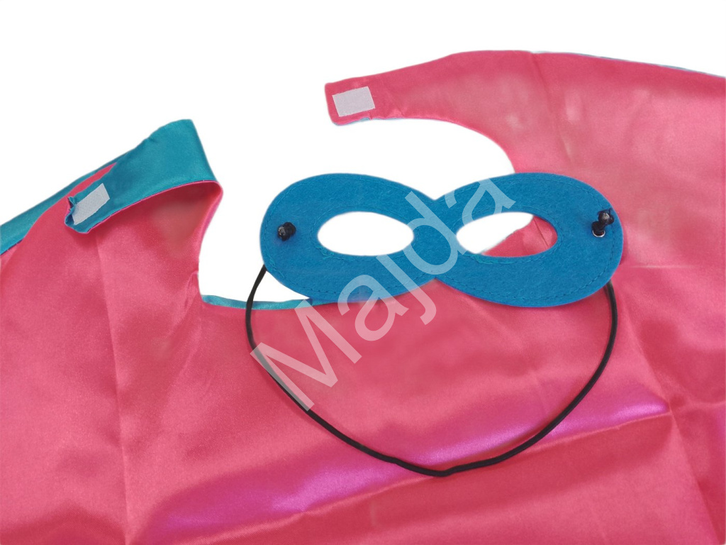 Maska je z měkké plsti a drží na hlavě pomocí elastické gumičky, což zaručuje pohodlné nošení po celý den. Kombinace pláště a masky vytváří zábavný převlek, který se hodí nejen na karneval, ale i pro každodenní hraní doma.