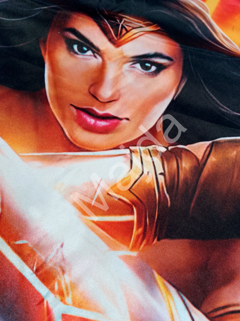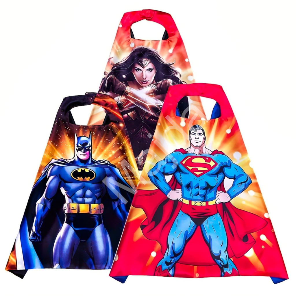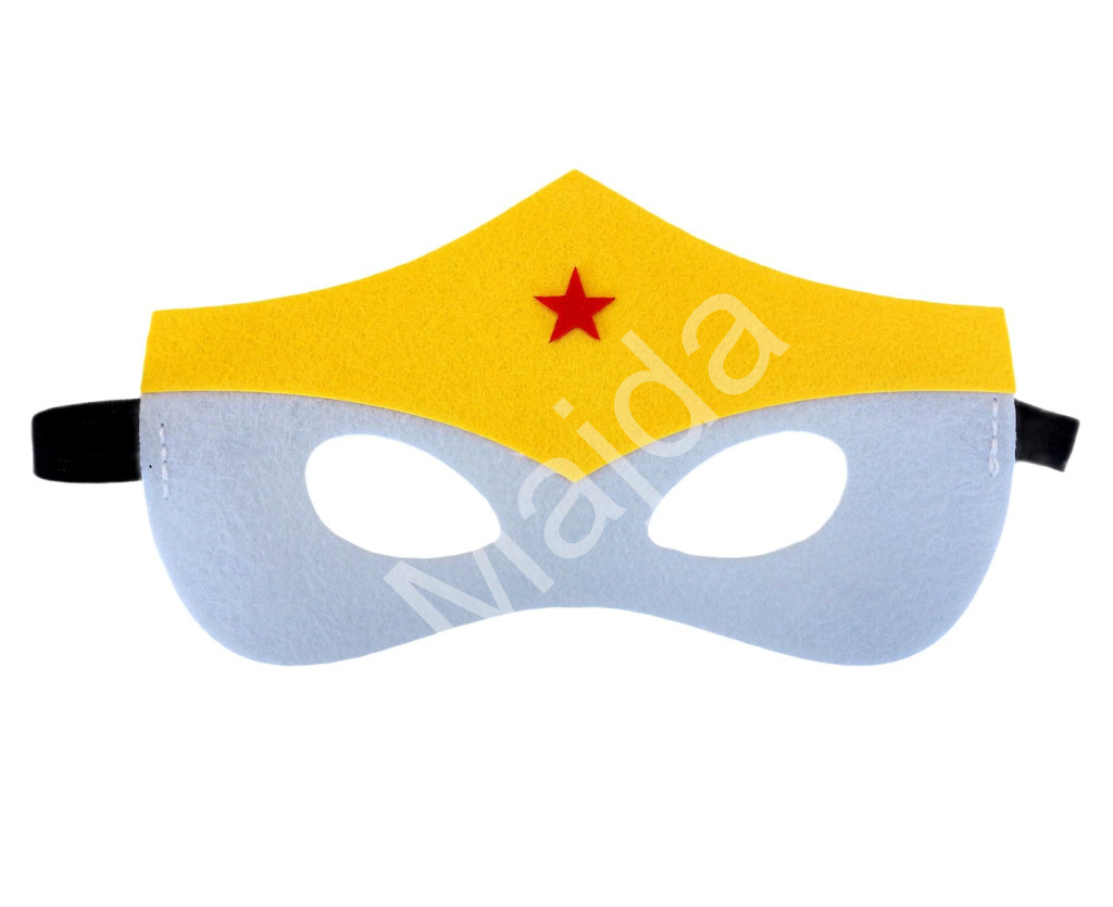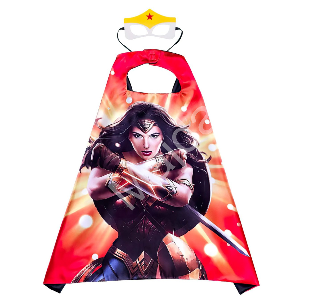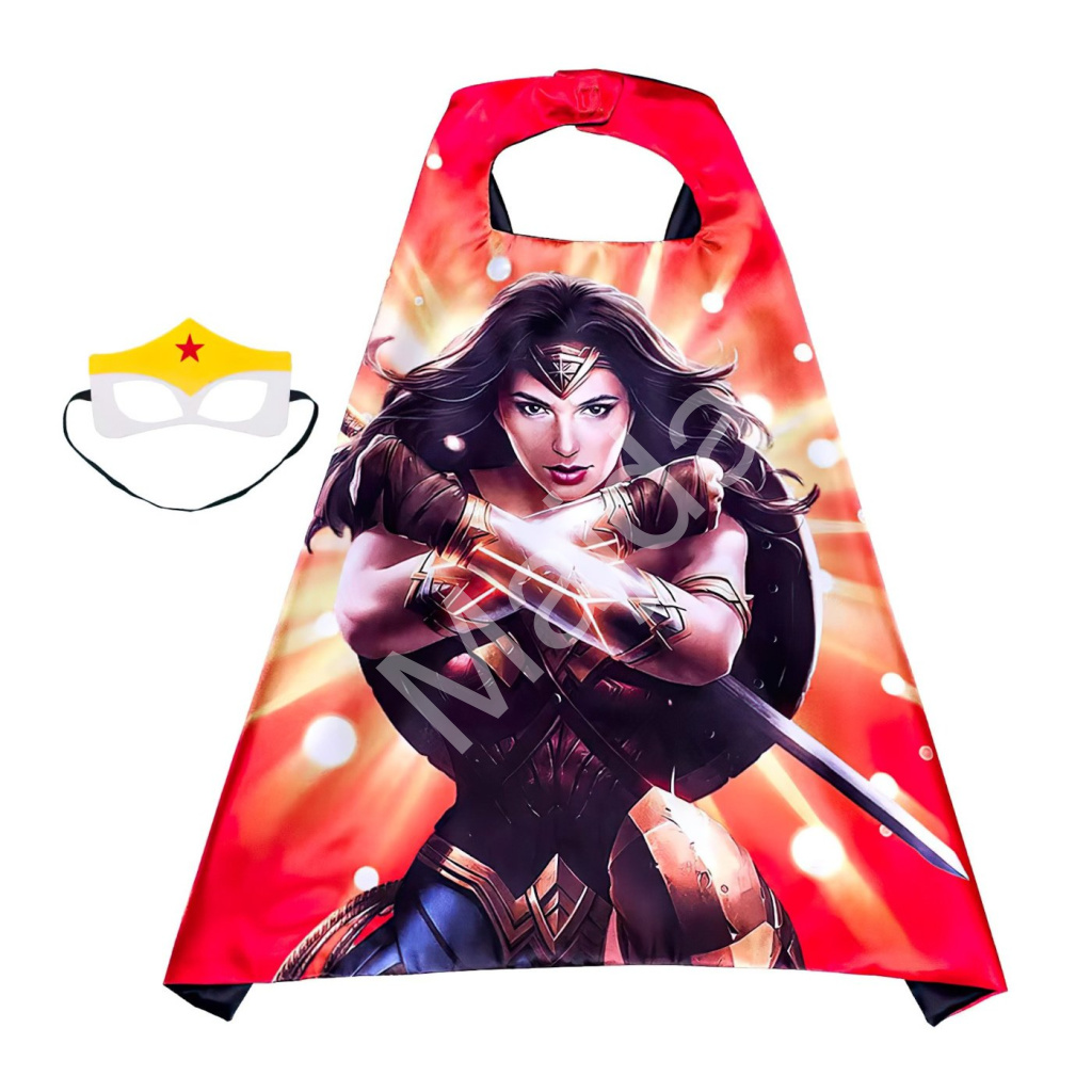 Sada zahrnuje výrazný plášť s realistickým potiskem Wonder Woman v bojovém postoji a stylovou žlutobílou masku se symbolem hvězdy, která podtrhuje celkový hrdinský vzhled.