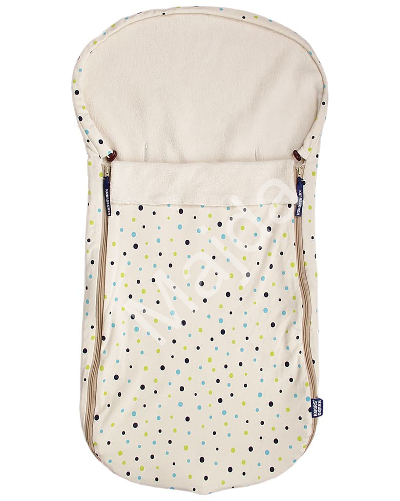 Lehký letní fusak z bio bavlny v přírodní barvě s motivem jemných puntíků. Vhodný do kočárků i autosedaček 0/0+, vyrobený v ČR.