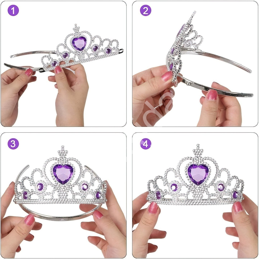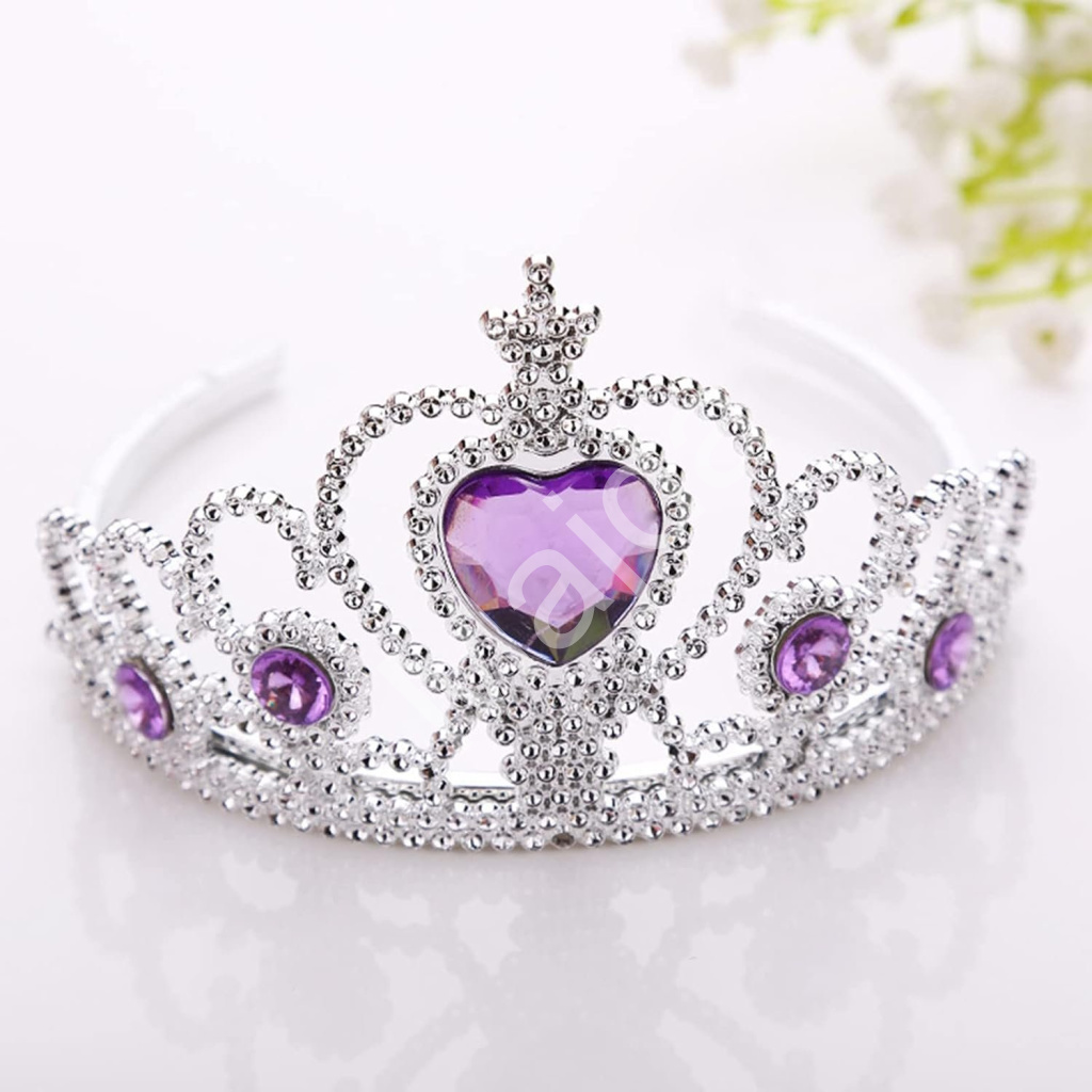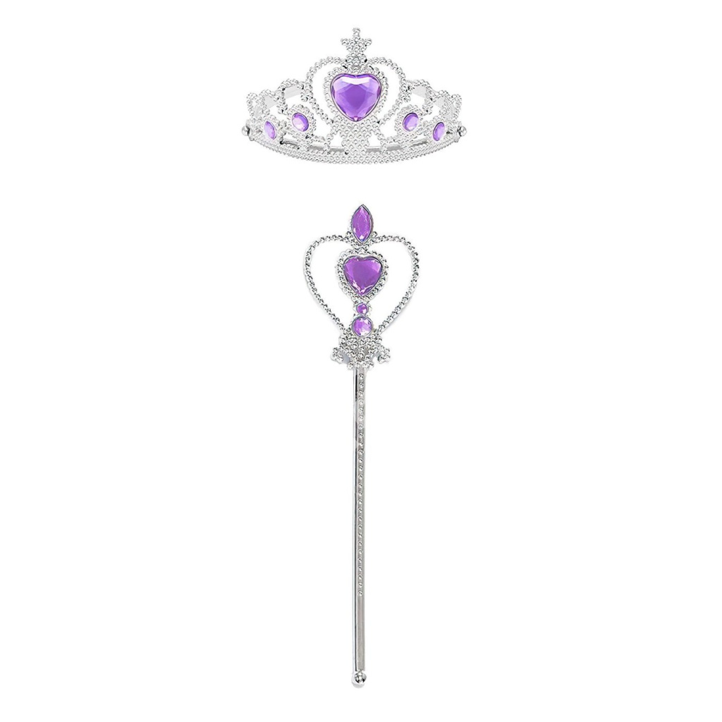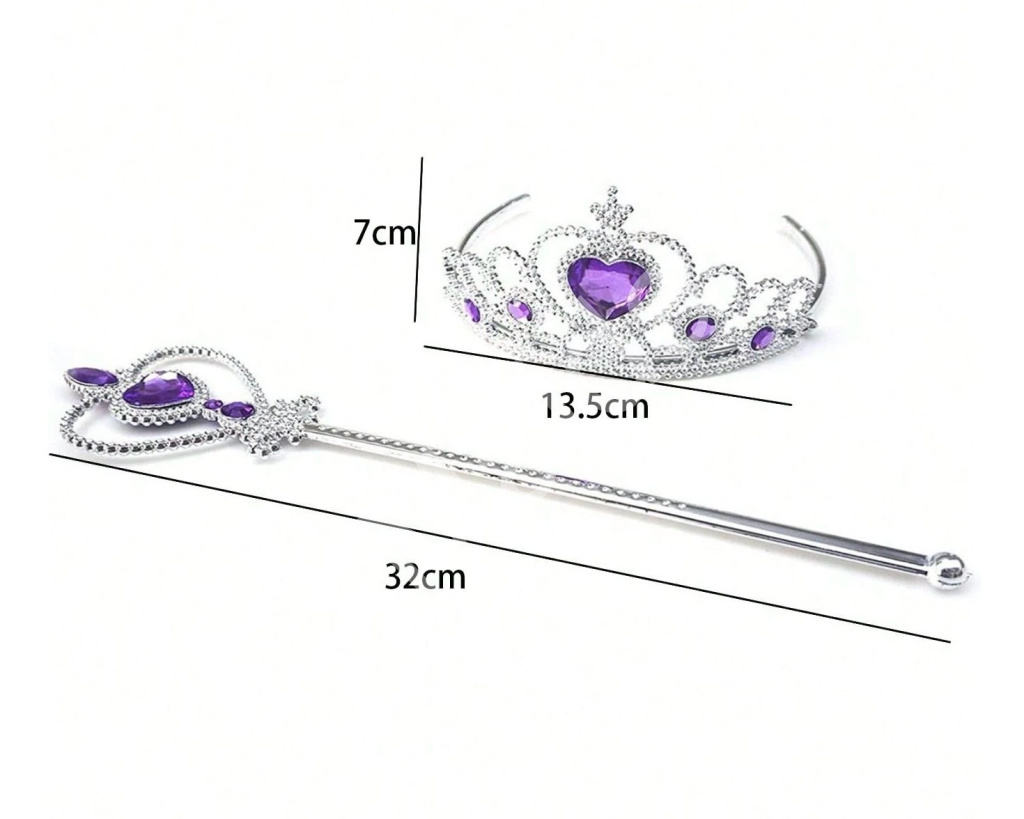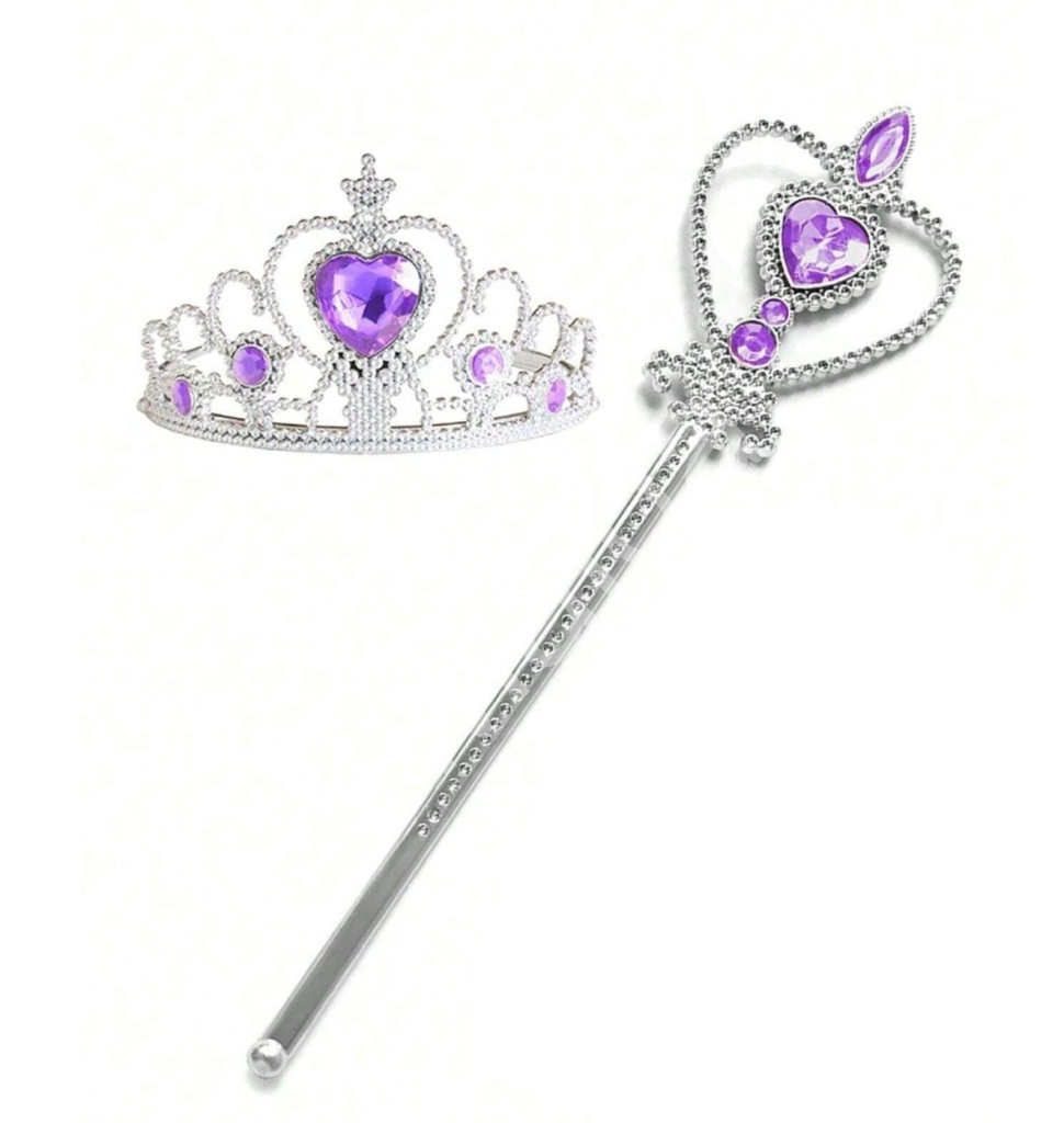 Elegantní korunka a ladící žezlo jsou zdobeny fialovými kamínky ve tvaru srdce, které dodávají celému vzhledu jemný královský nádech. Korunka je lehká a pohodlná na nošení, vyrobená z plastového materiálu s jemnými detaily, které připomínají kouzelnou atmosféru království. Díky pružnému provedení dobře drží na hlavě a je ideální pro dětské hraní i slavnostní chvíle.