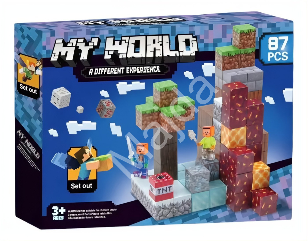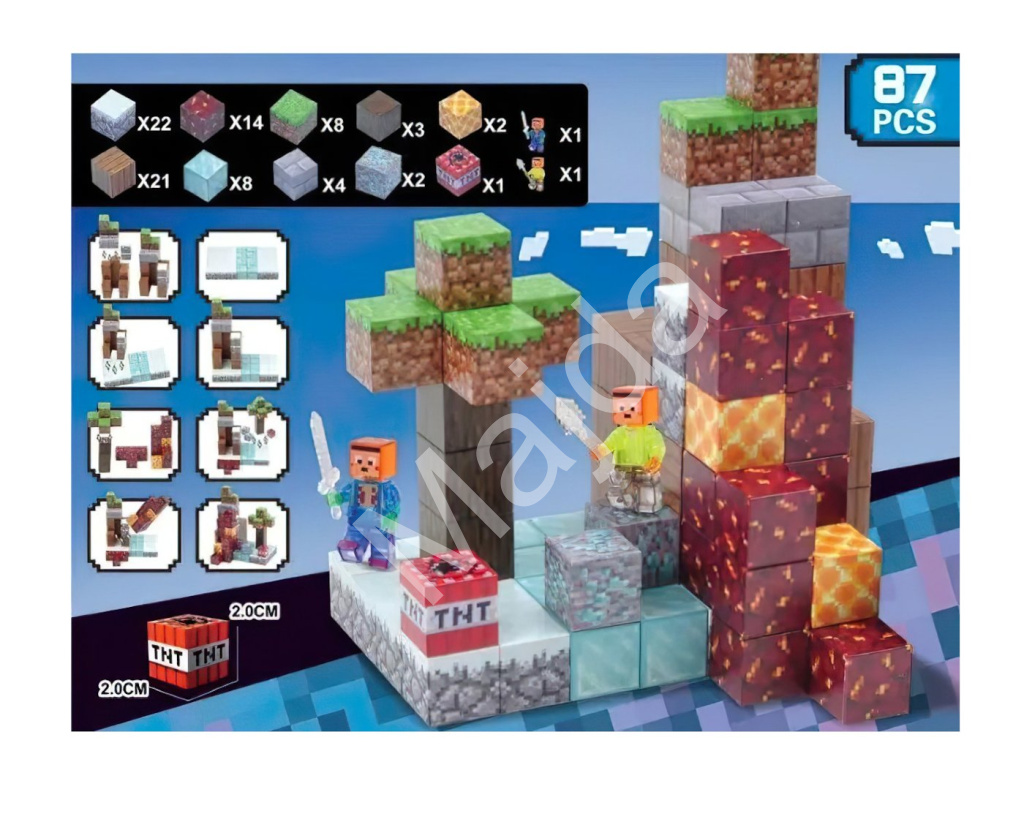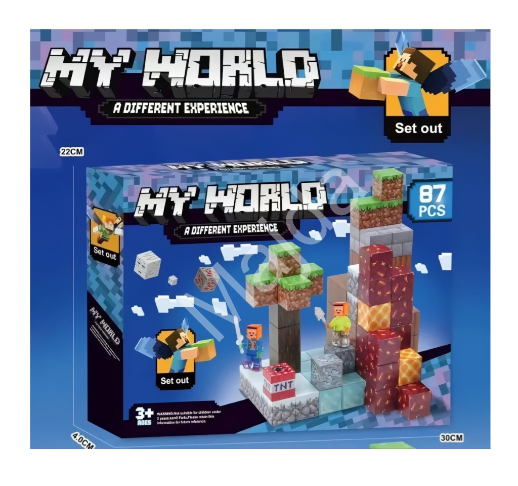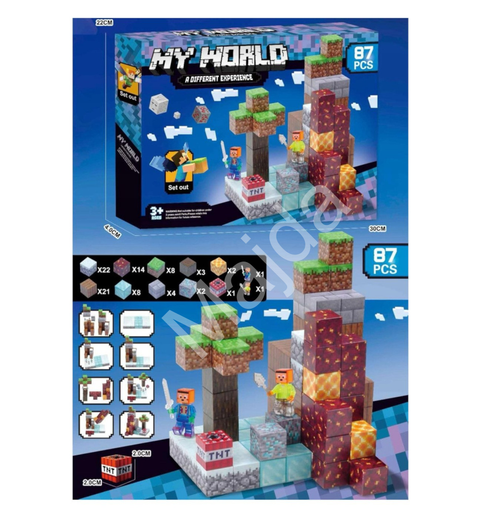 Stavebnice obsahuje 85 pevných dílků s magnetickým spojem, díky kterému lze snadno stavět i přestavovat. Každý blok je detailně potištěn tak, aby co nejvěrněji připomínal textury z Minecraftu – od kostek lávy a zeminy po stromové kmeny a diamantové kry. Figurky jsou vybaveny meči a čekají na tvé příkazy.