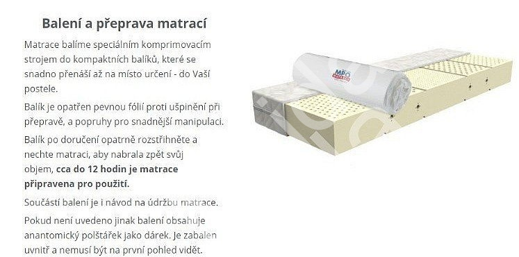Matrace balíme speciálním komprimovacím strojem do kompaktních balíků, které se snadno přenáší až na místo určení - do Vaší postele. Balík je opatřen pevnou fólií proti ušpinění při přepravě, a popruhy pro snadnější manipulaci. Balík po doručení opatrně rozstřihněte a rozložte matraci na rovný podklad, aby nabrala zpět svůj objem, cca do 12 hodin je matrace připravena pro použití.
