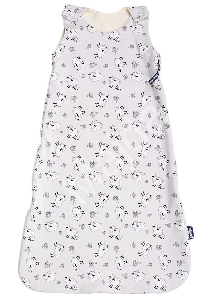 Vnější strana je tvořena 100% organickou bavlnou s roztomilým motivem oveček na šedém podkladu. Díky vnitřní podšívce z merino vlny je ideální pro celoroční používání.