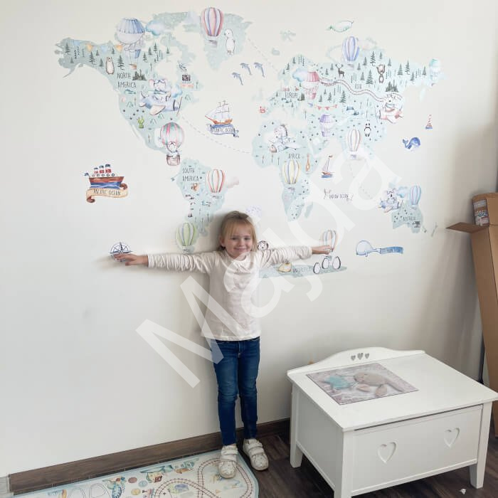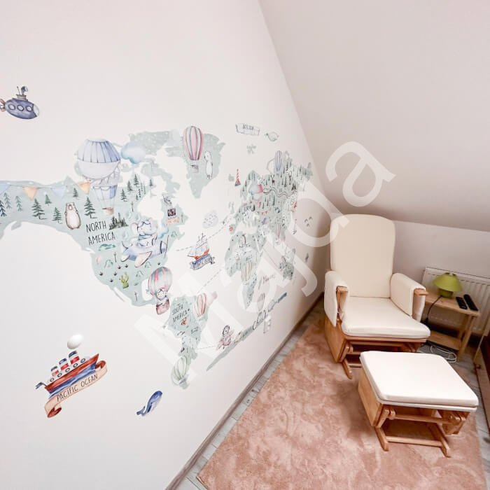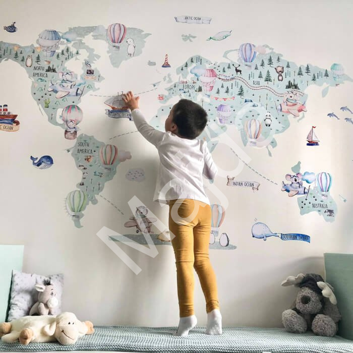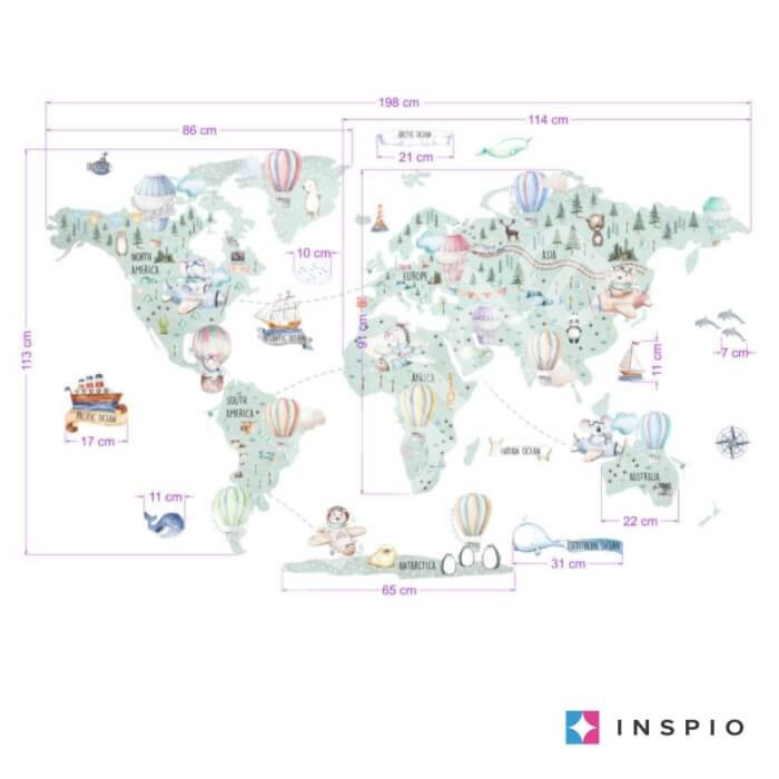 Mapa světa na zeď pro děti – samolepka INSPIO na zeď v hravém dětském provedení s balóny, letadly a zvířátky v neutrální barvě. Celkový rozměr mapy je 127 × 198 cm. Na mapě najdete: mezinárodní názvy světových kontinentů a… Více informací