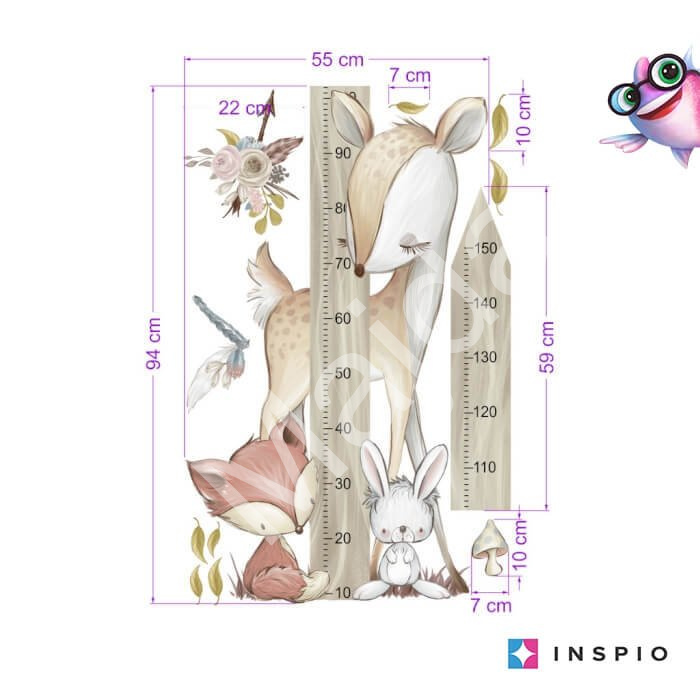 Dětský nalepovací metr je textilní samolepka na zeď dětského pokoje s lesními zvířátky. Sledujte, jak vaše dítě roste. Metr má rozměry 55 × 153 cm (bez příslušenství). Samolepky na zeď INSPIO . Speciální fólie INSPIOTEX.… Více informací