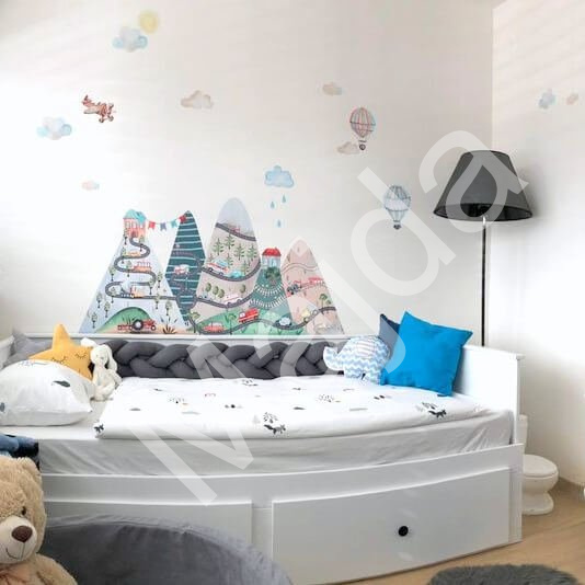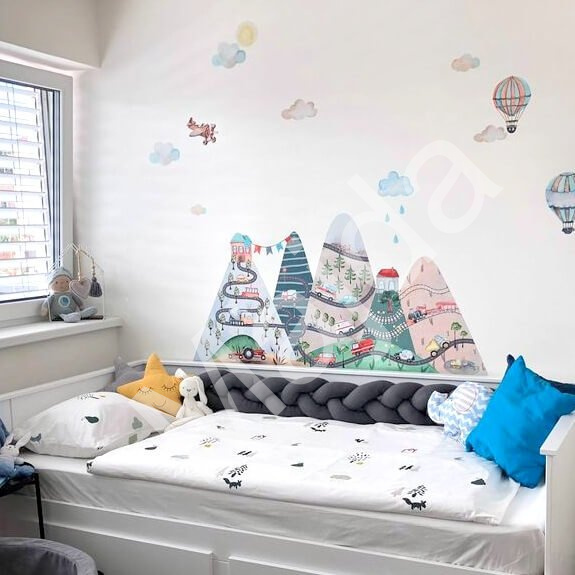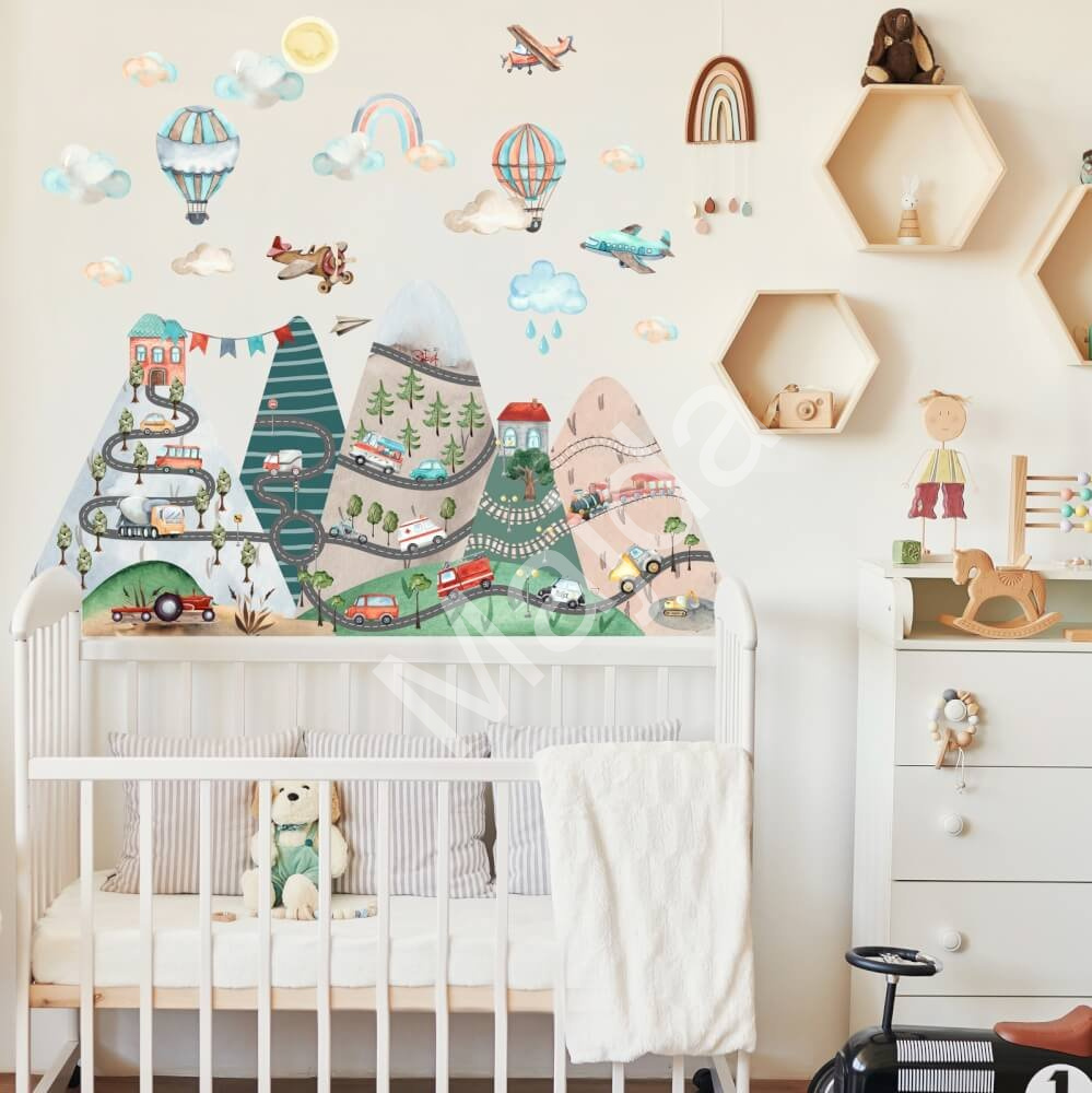 Samolepky, na kterých najdete kopce, autíčka a balóny vytvoří cestovatelskou atmosféru ve vašem dětském pokojíčku.