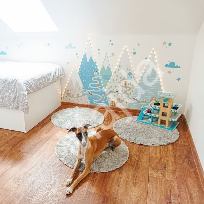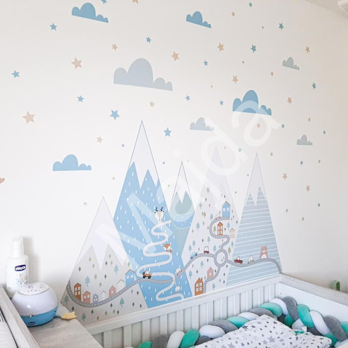Textilní samolepky na zeď INSPIO je možné několikrát přelepit a jsou vodou omyvatelné. Pohádkové kopce jsou vhodné do každého pokoje.