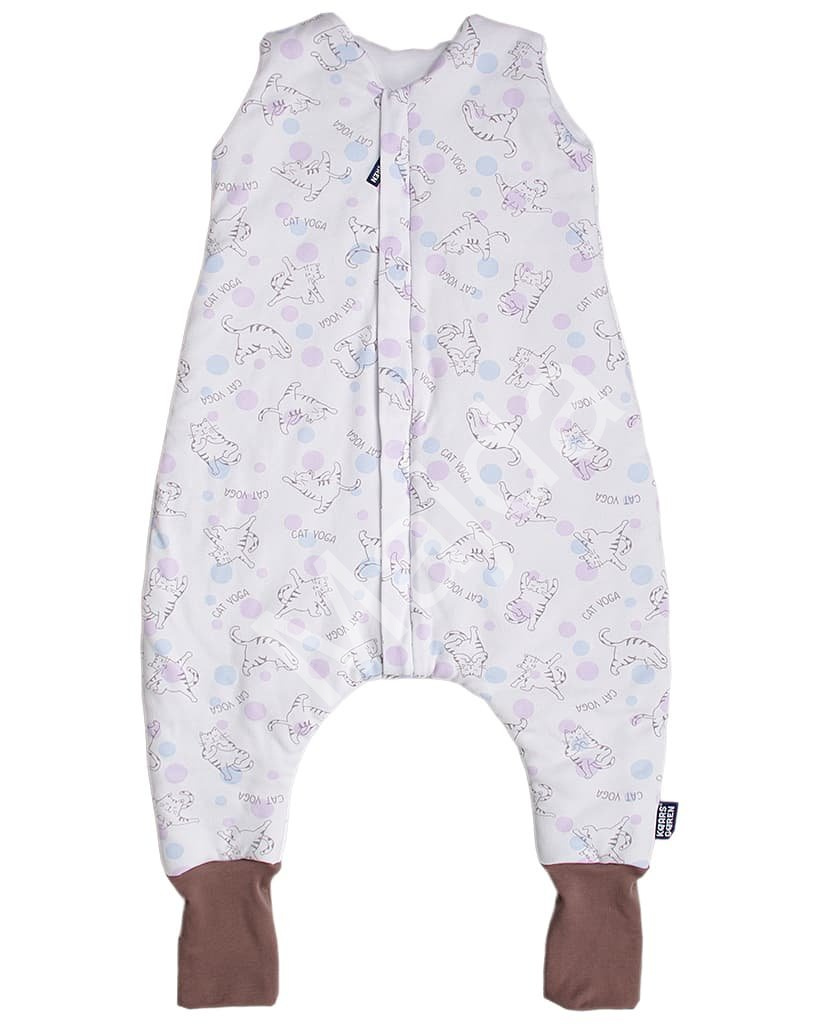 Dětský spací pytel ve smetanové barvě s veselým potiskem koček cvičících jógu. Díky nohavicím se dítě může volně pohybovat a překlápěcí náplety udrží nožičky v teple.